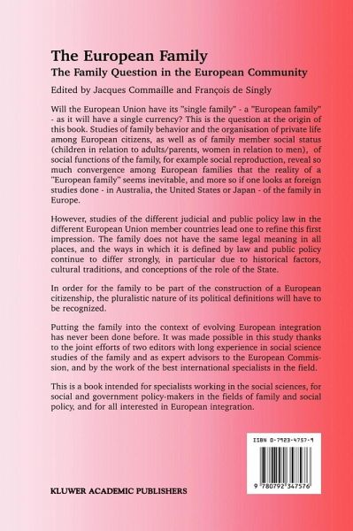 Will the European Union have its ¿single family - a ¿European family - as it will have a single currency? This is the question at the origin of this book. Studies of family behavior and the organization of private life among European citizens, as well as of family member social status (children in relation to adults/parents, women in relation to men), and of social functions of the family, for example social reproduction, reveal so much convergence among European families that the reality of a ¿European family seems inevitable, and more so if one looks at foreign studies done - in Australia, the United States or Japan - of the family in Europe.