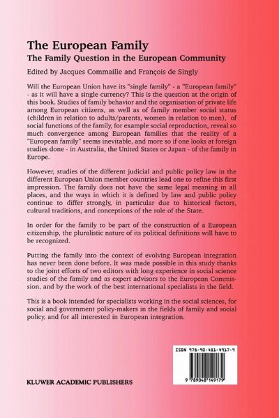 Will the European Union have its ¿single family - a ¿European family - as it will have a single currency? This is the question at the origin of this book. Studies of family behavior and the organization of private life among European citizens, as well as of family member social status (children in relation to adults/parents, women in relation to men), and of social functions of the family, for example social reproduction, reveal so much convergence among European families that the reality of a ¿European family seems inevitable, and more so if one looks at foreign studies done - in Australia, the United States or Japan - of the family in Europe.