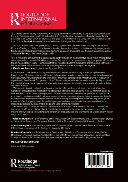 In recent years, the Leveson Inquiry in Great Britain, as well as the EU High-Level Group on Media Freedom and Pluralism, have stirred heated debates about media accountability and media self-regulation across Europe. How responsible are journalists? How well-developed are infrastructures of media self-regulation in the different European countries? How much commitment to media accountability is there in the media industry - and how actively do media users become involved in the process of media criticism via social media? With contributions from leading scholars in the field of journalism and mass communication, this handbook brings together reports on the status quo of media accountability in all EU members states as well as key countries close to Europe, such as Turkey and Israel. Each chapter provides an up-to-date overview of media accountability structures as well as a synopsis of relevant research, exploring the role of media accountability instruments in each national setting, including both media self-regulation (such as codes of ethics, press councils, ombudspersons) and new instruments that involve audiences and stakeholder groups (such as media blogs and user comment systems). A theoretically informed, cross-national comparative analysis of the state of media accountability in contemporary Europe, this handbook constitutes an invaluable basis for further research and policy-making and will appeal to students and scholars of media studies and journalism, as well as policy-makers and practitioners.