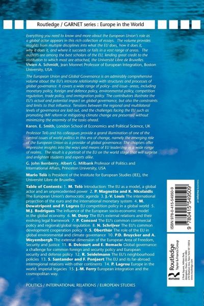 This book explores and analyses the multidimensional influence the European Union exerts in the world, focusing on its contribution to regional and global governance. Presenting a multidisciplinary approach with contributions by a panel of outstanding scholars from political science, economics, legal studies, philosophy and history, the book examines the EU as global player and international power in the making. The book is divided into three parts: Part I examines the influence of the EU as such on global governance, considering the Euro, the common market, the modernization policies for a knowledge society and its global role as both a multinational and regional democratic political system Part 2 focuses on the EU's external policies, including trade; humanitarian aid; the environment; climate change, migration, terrorism, crime and EU foreign policy Part 3 explores the EU as a global actor in the making and looks at issues including enlargement and the EU's neighbourhood policy; inter-regionalism; it critically addresses the weight of the historical legacies of Europe in the world and its cosmopolitan perspectives as well The European Union and Global Governance will be of vital interest to students and scholars of European Politics, International Relations, and European Studies.