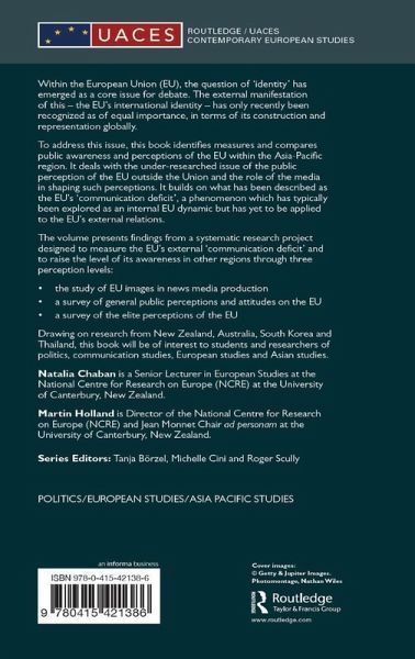 A central problem for the European Union is said to be that of the "politics of identity". Within this, the concept of the EU's international identity requires exploration in terms of how it is both constructed and represented globally. To address this issue, this book identifies measures and compares public awareness and perceptions of the EU within the Asia-Pacific region. It deals with the under-researched issue of the public perception of the EU outside the Union and the role of the media in shaping such perceptions. It builds on what has been described as the EU's 'communication deficit', a phenomenon which has typically been explored as an internal EU dynamic but has yet to be applied to the EU's external relations. The volume presents findings from a systematic research project designed to measure the EU's external 'communication deficit' and to raise the level of its awareness in other regions through three perception levels: The study of EU images in news mass media production A survey of general public perceptions and attitudes on the EU A survey of the elite perceptions of the EU. Drawing on research from New Zealand, Australia, South Korea and Thailand, this book will be of interest to students and researchers of politics, communication studies, European studies and Asian studies.