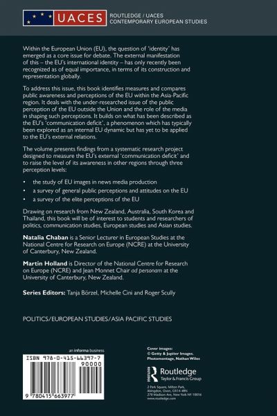 A central problem for the European Union is said to be that of the "politics of identity". Within this, the concept of the EU's international identity requires exploration in terms of how it is both constructed and represented globally. To address this issue, this book identifies measures and compares public awareness and perceptions of the EU within the Asia-Pacific region. It deals with the under-researched issue of the public perception of the EU outside the Union and the role of the media in shaping such perceptions. It builds on what has been described as the EU's 'communication deficit', a phenomenon which has typically been explored as an internal EU dynamic but has yet to be applied to the EU's external relations. The volume presents findings from a systematic research project designed to measure the EU's external 'communication deficit' and to raise the level of its awareness in other regions through three perception levels: The study of EU images in news mass media production A survey of general public perceptions and attitudes on the EU A survey of the elite perceptions of the EU. Drawing on research from New Zealand, Australia, South Korea and Thailand, this book will be of interest to students and researchers of politics, communication studies, European studies and Asian studies.