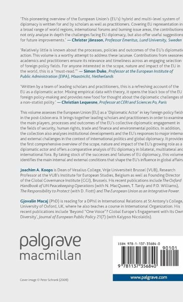 Foreword by Pierre Vimont, Secretary-General European External Action Service 1. Introduction: The EU as a Diplomatic Actor; Joachim A. Koops and Gjovalin Macaj 2. The EU as a Diplomatic Actor in the Post-Lisbon Era: Robust or Rootless Hybrid?; Michael H. Smith 3. EU Diplomacy in Global Governance: The Role of the EEAS; Knud Erik Jorgensen 4. Evaluating the Impact of EU Diplomacy: Pitfalls and Challenges; Yvonne Kleistra and Niels van Willigen 5. EU Diplomacy at the Individual Level: The Role and Impact of the EU Special Representatives; Dominik Tolksdorf 6. Speak Up! Getting the EU a Voice at the UN General Assembly; Fernando Andresen Guimaraes 7. The EU as a Coercive Diplomatic Actor? The EU-3 Initiative Towards Iran; Tom Sauer 8. The EU's Role and Performance within the G20 in the Area of Finance and Development; Peter Debaere 9. The EU as an International Trade Negotiator; Frank Hoffmeister 10. The EU as a Diplomatic Actor in the Field of Human Rights; Karen E. Smith 11. The European Union's Climate Change Diplomacy; Simon Schunz