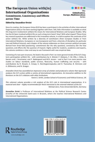 Since its creation, the European Union (EU) has been a participant in the activities of other International Organisations (IOs) or has been working together with them. Still, little information is available on what this long-term involvement with(in) IOs means for International Relations and European Studies. Why has the EU been involved with(in) IOs on such a long-term basis? How? With what impact? These three key research questions are addressed in this innovative volume, in a bid to explore the continuity of EU action with(in) IOs. While written by a diversity of authors (from European Studies or from International Relations, Europeans or non-Europeans) and from a diversity of disciplines (in particular Law and Political Science), each chapter of the volume elaborates on three common political concepts derived from three-fold questioning: commitment (for the why question), consistency (for the how question), and effects (for the question of impact). Consisting of a two part structure, the book is focussed in Part I on more general trends of the EU's long-term participation with(in) IOs - with contributions by A. Wetzel, P. Debaere, F. De Ville, J. Orbie, B. Saenen and J. Verschaeve, and P. Nedergaard and M. D. Jensen - and in Part II on more precise case studies on labour standards, public services, flexicurity, human trafficking and security - with contributions by R. Kissack, A. Crespy, E. Xiarchogiannopoulou and D. Tsarouhas, B. Simmons and A. DiSilvestro, and N. Græger. Highly useful for students, academics and experts, this volume combines a clear and easy-to-use framework with new empirical data.