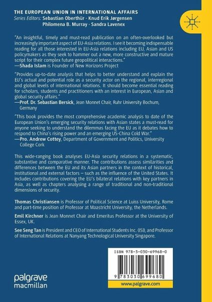 This wide-ranging book analyses EU-Asia security relations in a systematic, substantive and comparative manner. The contributions assess similarities and differences between the EU and its Asian partners with respect to levels of threat perception, policy response and security cooperation in the context of historical, institutional and external factors - such as the influence of the United States. The book presents original empirical research organised in four parts: a number of contributions providing discussions of the global context in which EU-Asia security relations develop; a series of chapters covering the range of dimensions of EU-Asian security, including both traditional and non-military aspects of security; chapters addressing the specific issues touching on bilateral relations between the EU and its partners in the Asia-Pacific region; and a final part presenting the overall findings across the various contributions together with the future outlook for EU-Asia securityrelations.