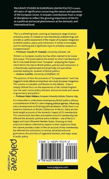 'This is a refreshing book, covering an impressive range of actors and policy areas. It is based on new theoretical underpinnings and provides a careful assessment of the impact of European integration on British politics, policy and institutions. It will be a formidable tool for teaching and a significant input to scholarly research on Europeanization.' - Professor Claudio M. Radaelli, University of Exeter, UK.