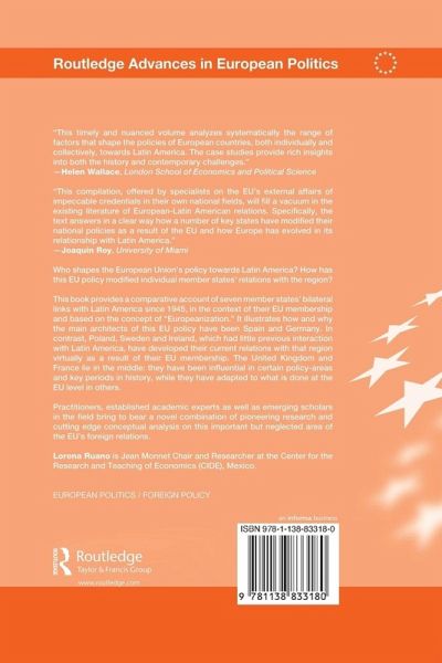 Who shapes the European Union's policy towards Latin America? How has this EU policy modified individual member states' relations with the region? This book provides a comparative account of seven member states' bilateral links with Latin America since 1945, in the context of their EU membership and based on the concept of 'Europeanization'. It illustrates how and why the main architects of this EU policy have been Spain and Germany. In contrast, Poland, Sweden and Ireland, which had little previous interaction with Latin America, have developed their current relations with that region virtually as a result of their EU membership. The United Kingdom and France lie in the middle: they have been influential in certain policy-areas and key periods in history, while they have adapted to what is done at the EU level in others. Practitioners, established academic experts as well emerging scholars in the field bring to be bear a novel combination of pioneering research and cutting edge conceptual analysis on this important but neglected area of the EU's foreign relations.