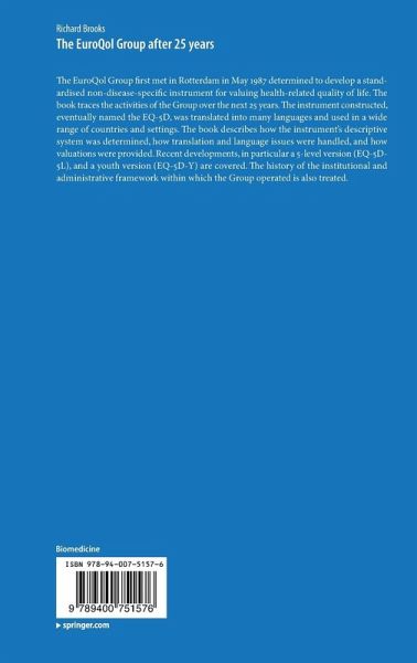 The EuroQol Group first met in Rotterdam in May 1987 determined to develop a standardised non-disease-specific instrument for valuing health-related quality of life. The book traces the activities of the Group over the next 25 years. The instrument constructed, eventually named the EQ-5D, was translated into many languages and used in a wide range of countries and settings. The book describes how the instrument's descriptive system was determined, how translation and language issues were handled, and how valuations were provided. Recent developments, in particular a 5-level version (EQ-5D-5L), and a youth version (EQ-5D-Y) are covered. The history of the institutional and administrative framework within which the Group operated is also treated.