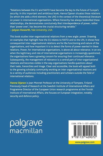 This book studies inter-organisational relations from a new angle: power. Drawing on examples that highlight how the EU relates to NATO and to the UN, it shows how consequential inter-organisational relations are for the functioning and nature of the organisations, and how important it is to detect the forms of power exerted in these relations. Power, for international organisations, is above all about relevance. In an era when the legitimacy and role of international organisations is increasingly questioned, the organisations have a growing concern for ensuring their continued relevance. Subsequently, the management of relevance is a central part of inter-organisational relations and becomes visible in the way organisations handle questions about their tasks, hierarchies and image. Clear and accessible, the book will appeal both to the growing scholarly community working on inter-organisational relations and to a variety of audiences including practitioners and scholars outside the field of international relations.