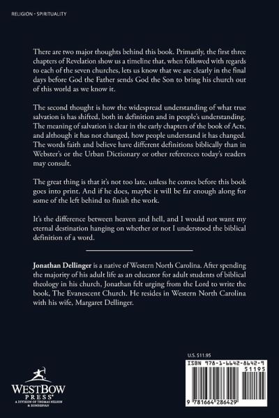 There are two major thoughts behind this book. Primarily, the first three chapters of Revelation show us a timeline that, when followed with regards to each of the seven churches, lets us know that we are clearly in the final days before God the Father sends God the Son to bring his church out of this world as we know it. The second thought is how the widespread understanding of what true salvation is has shifted, both in definition and in people's understanding. The meaning of salvation is clear in the early chapters of the book of Acts, and although it has not changed, how people understand it has changed. The words faith and believe have different definitions biblically than in Webster's or the Urban Dictionary or other references today's readers may consult. The great thing is that it's not too late, unless he comes before this book goes into print. And if he does, maybe it will be far enough along for some of the left behind to finish the work. It's the difference between heaven and hell, and I would not want my eternal destination hanging on whether or not I understood the biblical definition of a word.