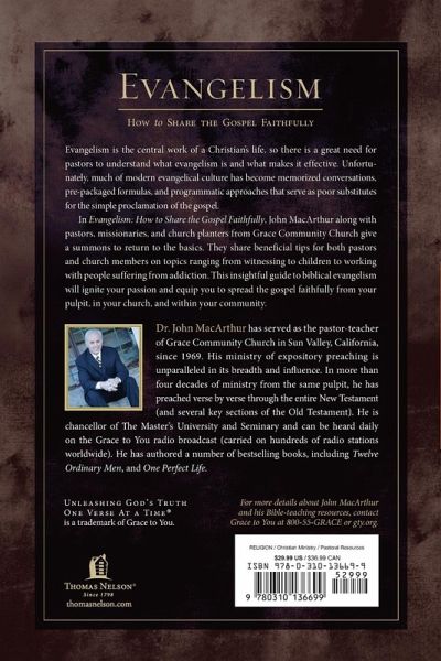Paul's challenge to Timothy 2,000 years ago remains a clarion call for pastors today: "Do the work of an evangelist, fulfill your ministry" (2 Tim 4:5). Because evangelism is the central work of a Christian's life, there is a great need for pastors to understand what evangelism is and what makes it effective. Much of modern evangelical culture has become memorized conversations, pre-packaged formulas, and programmatic approaches that serve as poor substitutes for the simple proclamation of the gospel. In Evangelism: How to Share the Gospel Faithfully, John MacArthur along with pastors, missionaries, and church planters from Grace Community Church give the summons to return to the basics. Evangelism covers four primary topicsTheological presuppositions and biblical foundations of evangelism Evangelism from a pastoral perspective One-on-one witnessing How outreach fits into and shapes the activities of the local church You'll learn theological principles of sharing the gospel and practical approaches to incorporating outreach into your life, including specialized areas, likeSharing the gospel with children and youth Witnessing to those with special needs Working with people suffering from addiction Immigrant outreach International missions There is an urgent need for the gospel in today's fallen world. This insightful guide to biblical evangelism will ignite your passion and equip you to spread the gospel faithfully from your pulpit, in your church, and within your community.