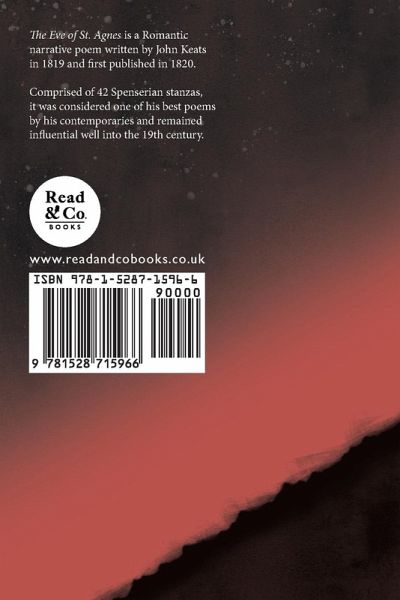 "The Eve of St. Agnes" is a Romantic narrative poem written by John Keats in 1819 and first published in 1820. Comprised of 42 Spenserian stanzas, it was considered one of his best poems by his contemporaries and remained influential well into the 19th century. John Keats (1795-1821) was an English Romantic poet and one of the most important figures in the second generation of Romantic poets, together with Percy Bysshe Shelley and Lord Byron. He died from tuberculosis at the age of 25, just four years after his work entered publication. Other notable works by this author include: "Ode to a Nightingale", "Sleep and Poetry", and "On First Looking into Chapman's Homer". A fantastic poem by a master Romantic poet that will appeal to all lovers of English poetry. This classic work is being republished now in a new edition complete with an introductory chapter from "The Mentor - Famous English Poets" by Hamilton Wright Mabie.