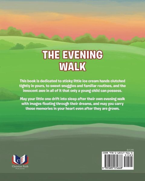 This book is dedicated to sticky little ice cream hands clutched tightly in yours, to sweet snuggles and familiar routines, and the innocent awe in all of it that only a young child can possess. May your little one drift into sleep after their own evening walk with images floating through their dreams, and may you carry those memories in your heart even after they are grown.
