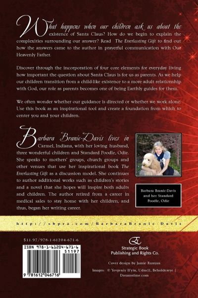 What happens when our children ask us about the existence of Santa Claus? How do we begin to explain the complexities surrounding our answer? Read The Everlasting Gift to find out how the answers came to the author in prayerful communication with Our Heavenly Father. Discover through the incorporation of four core elements for everyday living how important the question about Santa Claus is for us as parents. As we help our children transition from a child-like existence to a more adult relationship with God, our role as parents becomes one of being Earthly guides for them. We often wonder whether our guidance is directed or whether we work alone. Use this book as an inspirational tool and create a foundation from which to center you and your children. Barbara Branic-Davis lives in Carmel, Indiana, with her loving husband, three wonderful children and Standard Poodle, Odie. She speaks to mothers' groups, church groups and other venues that use her inspirational book The Everlasting Gift as a discussion model. She continues to author additional works such as children's stories and a novel that she hopes will inspire both adults and children. The author retired from a career in medical sales to stay home with her children, and thus, began her writing career. http://sbpra.com/BarbaraBranic-Davis