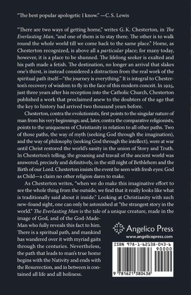 "The best popular apologetic I know." -C.¿S. Lewis In 1925, just three years after his reception into the Catholic Church, G.K. Chesterton published a work that proclaimed anew to the doubters of the age that the key to history had arrived nearly two thousand years before. Contra the evolutionists, he first points to the singular nature of man from his very beginnings; and, later, contra the comparative religionists, points to the uniqueness of Christianity in relation to all other paths. Two of those paths, the way of myth and the way of philosophy, were at war until Christ restored the world's sanity in the union of Story and Truth. In Chesterton's telling, the groaning and travail of the ancient world was answered, precisely and definitively, in the still night of Bethlehem and the Birth of our Lord. Chesterton insists the event be seen with fresh eyes: God as Child--a claim no other religion dares to make. As Chesterton writes, "when we do make this imaginative effort to see the whole thing from the outside, we find that it really looks like what is traditionally said about it inside." Looking at Christianity with such new-found sight, one can only be astonished at "the strangest story in the world." The Everlasting Man is the tale of a unique creature, man, made in the image of God, and of the God-Made-Man who fully reveals this fact to him. There is a spiritual path, and mankind has wandered over it with myriad gaits through the centuries. Nevertheless, the path that leads to man's true home begins with the Nativity and ends with the Resurrection, and in between is contained all life and all holiness.