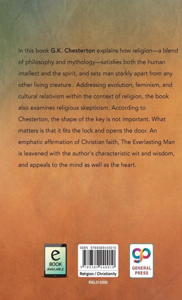 In this book G.K. Chesterton explains how religion-a blend of philosophy and mythology-satisfies both the human intellect and the spirit, and sets man starkly apart from any other living creature. Addressing evolution, feminism, and cultural relativism within the context of religion, the book also examines religious skepticism. According to Chesterton, the shape of the key is not important. What matters is that it fits the lock and opens the door. An emphatic affirmation of Christian faith, The Everlasting Man is leavened with the author's characteristic wit and wisdom, and appeals to the mind as well as the heart.