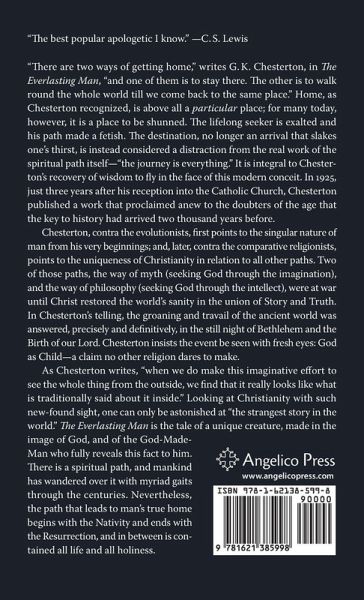 "The best popular apologetic I know." -C. S. Lewis In 1925, just three years after his reception into the Catholic Church, G.K. Chesterton published a work that proclaimed anew to the doubters of the age that the key to history had arrived nearly two thousand years before. Contra the evolutionists, he first points to the singular nature of man from his very beginnings; and, later, contra the comparative religionists, points to the uniqueness of Christianity in relation to all other paths. Two of those paths, the way of myth and the way of philosophy, were at war until Christ restored the world's sanity in the union of Story and Truth. In Chesterton's telling, the groaning and travail of the ancient world was answered, precisely and definitively, in the still night of Bethlehem and the Birth of our Lord. Chesterton insists the event be seen with fresh eyes: God as Child--a claim no other religion dares to make. As Chesterton writes, "when we do make this imaginative effort to see the whole thing from the outside, we find that it really looks like what is traditionally said about it inside." Looking at Christianity with such new-found sight, one can only be astonished at "the strangest story in the world." The Everlasting Man is the tale of a unique creature, man, made in the image of God, and of the God-Made-Man who fully reveals this fact to him. There is a spiritual path, and mankind has wandered over it with myriad gaits through the centuries. Nevertheless, the path that leads to man's true home begins with the Nativity and ends with the Resurrection, and in between is contained all life and all holiness.