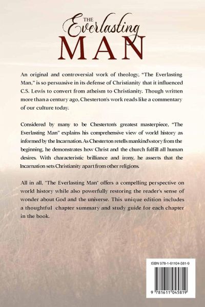 An original and controversial work of theology, "The Everlasting Man," is so persuasive in its defense of Christianity that it influenced C.S. Lewis to convert from atheism to Christianity. Though written more than a century ago, Chesterton's work reads like a commentary of our culture today. Considered by many to be Chesterton's greatest masterpiece, "The Everlasting Man" explains his comprehensive view of world history as informed by the Incarnation. As Chesterton retells mankind's story from the beginning, he demonstrates how Christ and the church fulfill all human desires. With characteristic brilliance and irony, he asserts that the Incarnation sets Christianity apart from other religions. All in all, "The Everlasting Man" offers a compelling perspective on world history while also powerfully restoring the reader's sense of wonder about God and the universe. This unique edition includes a thoughtful chapter summary and study guide for each chapter in the book.