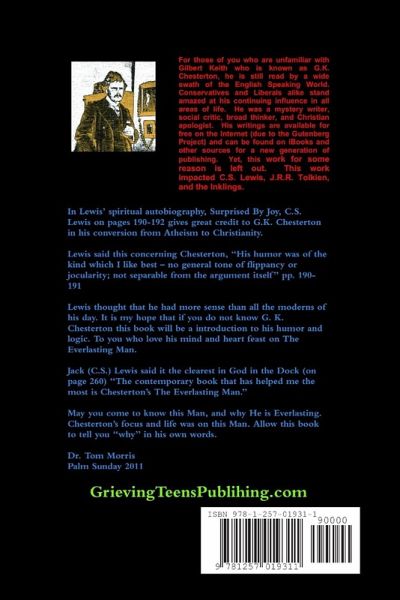 For those of you who are unfamiliar with Gilbert Keith who is known as G.K. Chesterton, he is still read by a wide swath of the English Speaking World. Conservatives and Liberals alike stand amazed at his continuing influence in all areas of life. He was a mystery writer, social critic, broad thinker, and Christian apologist. His writings are available for free on the Internet (due to the Gutenberg Project) and can be found on iBooks and other sources for a new generation of publishing. Yet, this work for some reason is left out. This work impacted C.S. Lewis, J.R.R. Tolkien, and the Inklings. This book has helped and continues to unite the Protestant and Christian worlds, which agree on the Everlasting Man - Jesus of Nazareth. What follows are some of the thoughts of Chesterton, and then some of Lewis' thoughts on G.K. Chesterton. GrievingTeensPublishing.com Cover Art was displayed at Biola University.