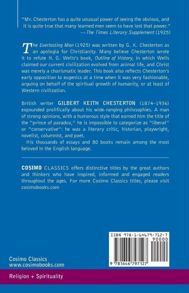 "Mr. Chesterton has a quite unusual power of seeing the obvious, and it is quite true that many learned men seem to have lost that power." -The Times Literary Supplement (1925) The Everlasting Man (1925) was written by G. K. Chesterton as an apologia for Christianity. Many believe Chesterton wrote it to refute H. G. Wells's book, Outline of History, in which Wells claimed our current civilization evolved from animal life, and Christ was merely a charismatic leader. This book also reflects Chesterton's early opposition to eugenics at a time when it was very fashionable, arguing on behalf of the spiritual growth of humanity, or at least of Western civilization.