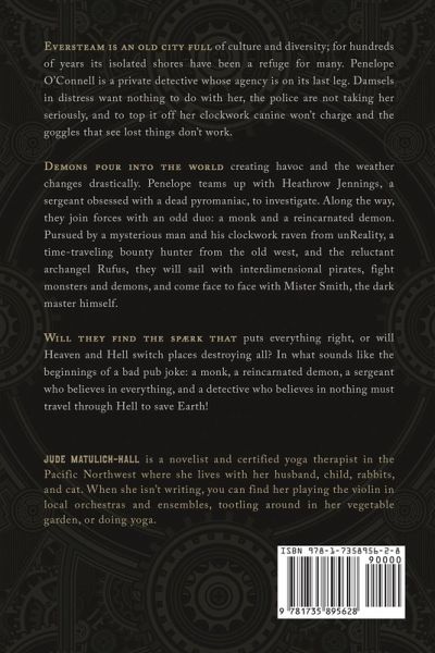 Eversteam is an old city full of culture and diversity; for hundreds of years its isolated shores have been a refuge for many. It's about to become the center of a steampunk mystery. Penelope O'Connell is a private detective whose agency is on its last leg. Damsels in distress want nothing to do with her, the police are not taking her seriously, and to top it off her clockwork canine won't charge and the goggles that see lost things don't work. Demons pour into the world creating havoc and the weather changes drastically. Penelope teams up with Heathrow Jennings, a sergeant obsessed with a dead pyromaniac, to investigate. Along the way, they join forces with an odd duo: a monk and a reincarnated demon. Pursued by a mysterious man and his clockwork raven from unReality, a time-traveling bounty hunter from the old west, and the reluctant archangel Rufus, they will sail with interdimensional pirates, fight monsters and demons, and come face to face with Mister Smith, the dark master himself. Will they find the spærk that puts everything right, or will Heaven and Hell switch places destroying all? In what sounds like the beginnings of a bad pub joke: a monk, a reincarnated demon, a sergeant who believes in everything, and a detective who believes in nothing must travel through Hell to save Earth! Join us for this amazing journey through Hell itself.