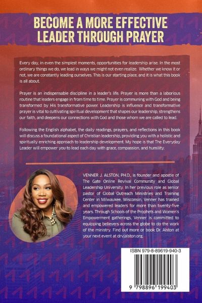 Every day, in even the simplest moments, opportunities for leadership arise. In the most ordinary things we do, we lead in ways we might not even realize.Whether we know it or not, we are constantly leading ourselves. This is our starting place, and it is what this book is all about. Prayer is an indispensable discipline in a leader's life. Prayer is more than a laborious routine that leaders engage in from time to time. Prayer is communing with God and being transformed by His transformative power. Leadership is influence and transformative prayer is vital to cultivating spiritual development that shapes our leadership, strengthens our faith, and deepens our connections with God and those whom we are called to lead. Following the English alphabet, the daily readings, prayers, and reflections in this book will discuss a foundational aspect of Christian leadership, providing you with a holistic and spiritually enriching approach to leadership development. My hope is that The Everyday Leader will empower you to lead each day with grace, compassion, and humility.