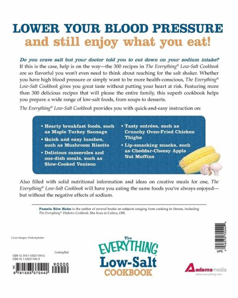 According to the American Dietetic Association, Americans consume three times the suggested daily salt intake. For many people, too much salt can cause a host of medical conditions including high blood pressure, which can lead to heart disease and stroke. Featuring 300 delicious low-salt meals that would please even the pickiest eater, The Everything Low-Salt Cookbook also provides specific instructions on how to eat, what to eat, and how to curb those between-meal salt cravings.The quick-and-easy cookbook features:Appetizers, such as Sweet Stuff Guacamole Dip Seafood, such as Baked Orange Roughy in White Wine Unique sandwiches, such as Meat-Tofu Burgers with Cheese Ethnic cuisine, such as Curried Couscous Healthy desserts, such as Veggie-Fruit Salad Featuring important dietary information such as calorie counts, fat grams, carbohydrates, protein, and sodium for each recipe, The Everything Low-Salt Cookbook will have you throwing out your salt shakers and serving up flavorful dishes for everyone!