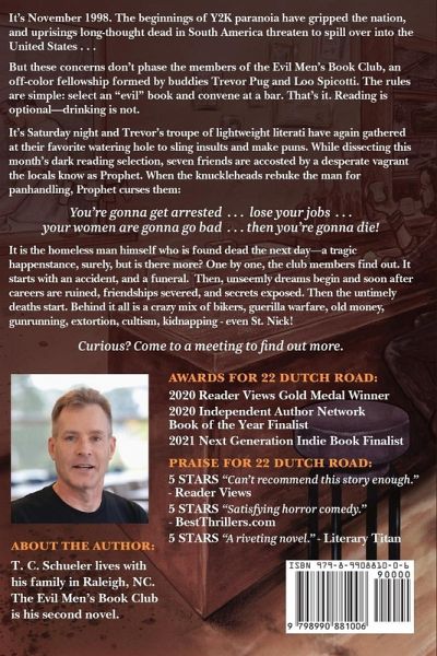 "The Evil Men's Book Club" is a humorous paranormal horror novel about a group of bored thirty-something men who form a book club on a lark to read books "dudes want to read." It takes place in the Washington, DC area in the late 90s. The club only has two rules: (1) always meet at a bar, and (2) you don't have to read the book. During one of their club gatherings, the guys offend a homeless panhandler who curses them: they will get arrested, then lose their jobs, their women, and ultimately their lives. The characters are suburban men going through the normal throes of marriage and fatherhood, but underneath their beer-fueled wise-cracking, secrets abound: jungle kidnapping PTSD, vigilantism, cross-dressing, alcoholism, race war prep, counseling to combat a "jinxed" love life, marital strife, prison, a struggling art studio, biker gang affiliation, illegal immigration, murder, old money, a mugging gone horribly wrong, loansharking, undercover ATF work, and last but not least, overzealous Christmas decoration. On top of these issues, there may be a real curse: members' lives slowly but surely begin to unravel. The target audience for this book is Xers and Boomers, those brought up in the 90s, fans of Stephen King and Dean Koontz, those in recovery, and anyone with a perverse sense of humor. It is a story of survival and emotional growth, with an underdog vibe. T.C. Schueler won awards and mentions for his first novel, "22 Dutch Road" including best horror novel for 2020 (Reader Views), and was a 2020 Independent Author Network finalist.