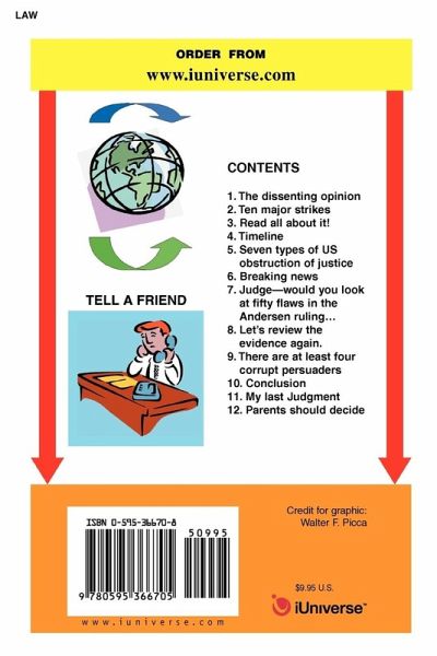 CONTENTS 1. The dissenting opinion 2. Ten major strikes 3. Read all about it! 4. Timeline 5. Seven types of US obstruction of justice 6. Breaking news 7. Judge-would you look at fifty flaws in the Andersen ruling. 8. Let's review the evidence again. 9. There are at least four corrupt persuaders 10. Conclusion 11. My last Judgment 12. Parents should decide