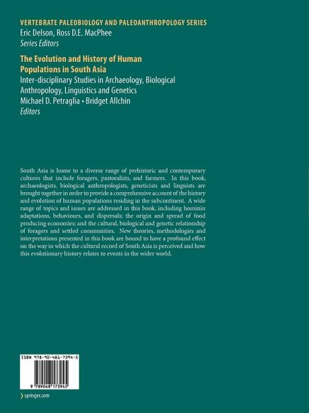 South Asia is home to a diverse range of prehistoric and contemporary cultures that include foragers, pastoralists, and farmers. In this book, archaeologists, biological anthropologists, geneticists and linguists are brought together in order to provide a comprehensive account of the history and evolution of human populations residing in the subcontinent. A wide range of topics and issues are addressed in this book, including hominin adaptations, behaviours, and dispersals; the origin and spread of food producing economies; and the cultural, biological and genetic relationship of foragers and settled communities. New theories, methodologies and interpretations presented in this book are bound to have a profound effect on the way in which the cultural record of South Asia is perceived and how this evolutionary history relates to events in the wider world.