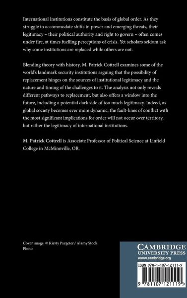 International institutions constitute the basis of global order. As they struggle to accommodate shifts in power and emerging threats, their legitimacy - their political authority and right to govern - often comes under fire, at times fuelling perceptions of crisis. Yet scholars seldom ask why some institutions are replaced while others are not. Blending theory with history, M. Patrick Cottrell examines some of the world's landmark security institutions, arguing that the possibility of replacement hinges on the sources of institutional legitimacy and the nature and timing of the challenges to it. The analysis not only reveals different pathways to replacement, but also offers a window into the future, including a potential dark side of too much legitimacy. Indeed, as global society becomes ever more dynamic, the fault lines of conflict with the most significant implications for order will not occur over territory, but rather over the legitimacy of international institutions.