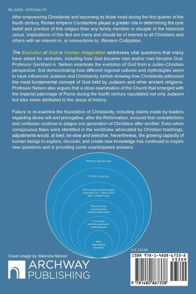 After empowering Christianity and becoming its titular head during the first quarter of the fourth century, Roman emperor Constantine played a greater role in determining the core belief and practice of this religion than any family member or disciple of the historical Jesus. Implications of this fact are many and should be of interest to all Christians and others with an interest in, or connections to, Western Civilization. The Evolution of God in Human Imagination addresses vital questions that many have asked for centuries, including how God became man and/or man became God. Professor Gersham A. Nelson examines the evolution of God from a Judeo-Christian perspective, first demonstrating how different regional cultures and mythologies seem to have influenced Judaism and Christianity, before showing how Christianity jettisoned the most fundamental concept of God held by Judaism and other ancient religions. Professor Nelson also argues that a close examination of the Church that emerged with the imperial patronage of Rome during the fourth century repudiated not only Judaism but also views attributed to the Jesus of history. Failure to re-examine the foundation of Christianity, including claims made by leaders regarding divine will and prerogative, after the Reformation, ensured that contradictions and confusion continue to plague one generation of Christians after another. Even when conspicuous flaws were identified in the worldview advocated by Christian teachings, adjustments would, at best, be slow and selective. Nevertheless, the growing capacity of human brings to explore, discover, and create new knowledge has continued to inspire new questions and is providing some unanticipated answers.