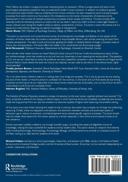 'Prof. Hallam has written a unique and most interesting book on evolution. What is unique about this book is the psychological perspective applied to help us understand modern human evolution. In addition to traditional genetic and anatomical topics Hallam helps us understand how human evolution has been shaped by social and psychological processes from early hominins to the present. His introduction to the human characteristic of cleverness and its development in the context of multiple evolutionary processes is both unique and brilliant. The text consists of 81 relatively brief and interesting sections on topics that can be read in nearly any order to form a meaningful Gestalt or mosaic without over-taxing the reader's ability to attend, comprehend, or focus. The book is most informative and is a pleasure to read without requiring any special knowledge or background.'