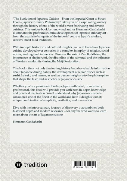 Discover the fascinating philosophy of Japanese cuisine - in all its depth, history, and diversity!Immerse yourself in the unique culinary journey "The Evolution of Japanese Cuisine - From the Imperial Court to Street Food - Japan's Culinary Philosophy," a comprehensive reference work on the development of Japanese culinary culture from early imperial banquets to modern street food on the bustling streets of Tokyo and Osaka.This exceptional book by renowned author Hermann Candahashi combines popular scientific analysis, cultural depth, and gripping storytelling in a fascinating blend that will delight history buffs, culinary enthusiasts, Japan fans, and specialist readers alike. From the influences of Zen Buddhism to the disciplined culinary culture of the samurai to the Western influences of the Meiji period - here you will learn how taste, philosophy, and aesthetics have evolved in Japan over the centuries.What makes this book special:- A unique look at the historical roots of Japanese cuisine- In-depth information on regional specialties from Hokkaido to Okinawa- Exciting insights into the significance of shojin ryori, kaiseki, and sushi- Presented in an understandable way for laypeople, yet in-depth for experts- Ideal for gourmets, Japanologists, travelers, food bloggers, and professional chefsLearn why Japanese cuisine is among the most renowned in the world today - and how deep-rooted traditions, religious influences, regional peculiarities, and historical upheavals continue to shape it today.A must-read for anyone who wants to know: What makes Japanese cuisine so unique - and what can we learn from it?With the help of this multifaceted work, enter a world full of enjoyment, knowledge, and cultural depth - for your library, your kitchen, or your next adventure in Japan!