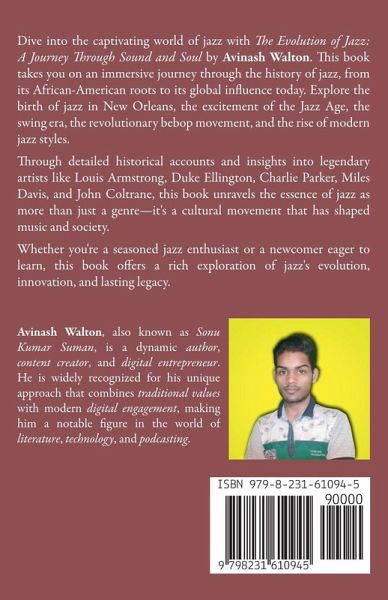 Dive into the captivating world of jazz with The Evolution of Jazz: A Journey Through Sound and Soul by Avinash Walton. This book takes you on an immersive journey through the history of jazz, from its African-American roots to its global influence today. Explore the birth of jazz in New Orleans, the excitement of the Jazz Age, the swing era, the revolutionary bebop movement, and the rise of modern jazz styles. Through detailed historical accounts and insights into legendary artists like Louis Armstrong, Duke Ellington, Charlie Parker, Miles Davis, and John Coltrane, this book unravels the essence of jazz as more than just a genre-it's a cultural movement that has shaped music and society. Whether you're a seasoned jazz enthusiast or a newcomer eager to learn, this book offers a rich exploration of jazz's evolution, innovation, and lasting legacy.
