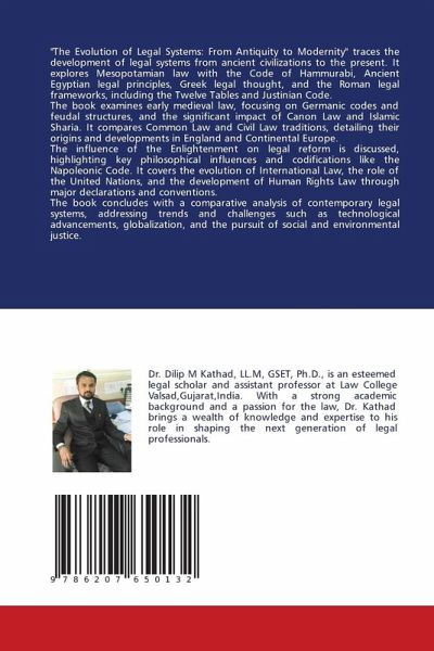 "The Evolution of Legal Systems: From Antiquity to Modernity" traces the development of legal systems from ancient civilizations to the present. It explores Mesopotamian law with the Code of Hammurabi, Ancient Egyptian legal principles, Greek legal thought, and the Roman legal frameworks, including the Twelve Tables and Justinian Code.The book examines early medieval law, focusing on Germanic codes and feudal structures, and the significant impact of Canon Law and Islamic Sharia. It compares Common Law and Civil Law traditions, detailing their origins and developments in England and Continental Europe.The influence of the Enlightenment on legal reform is discussed, highlighting key philosophical influences and codifications like the Napoleonic Code. It covers the evolution of International Law, the role of the United Nations, and the development of Human Rights Law through major declarations and conventions.The book concludes with a comparative analysis of contemporary legal systems, addressing trends and challenges such as technological advancements, globalization, and the pursuit of social and environmental justice.