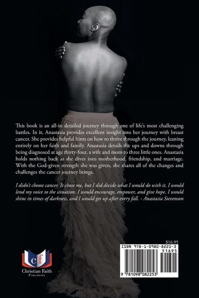 This book is an all-in detailed journey through one of life's most challenging battles. In it, Anastasia provides excellent insight into her journey with breast cancer. She provides helpful hints on how to thrive through the journey, leaning entirely on her faith and her family. Anastasia details the ups and downs through being diagnosed at age thirty-four, a wife and mom to three little ones. Anastasia holds nothing back as she dives into motherhood, friendship, and marriage. With the God-given strength she was given, she shares all of the changes and challenges the cancer journey brings. I didn't choose cancer. It chose me, but I did decide what I would do with it. I would lend my voice to the situation. I would encourage, empower, and give hope. I would shine in times of darkness, and I would get up after every fall. - Anastasia Stevenson