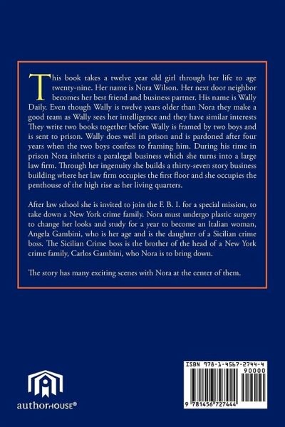 This book takes a twelve year old girl through her life to age twenty-nine. Her name is Nora Wilson. Her next door neighbor becomes her best friend and business partner. His name is Wally Daily. Even though Wally is twelve years older than Nora they make a good team as Wally sees her intelligence and they have similar interests They write two books together before Wally is framed by two boys and is sent to prison. Wally does well in prison and is pardoned after four years when the two boys confess to framing him. During his time in prison Nora inherits a paralegal business which she turns into a large law firm. Through her ingenuity she builds a thirty-seven story business building where her law firm occupies the first floor and she occupies the penthouse of the high rise as her living quarters. After law school she is invited to join the F. B. I. for a special mission, to take down a New York crime family. Nora must undergo plastic surgery to change her looks and study for a year to become an Italian woman, Angela Gambini, who is her age and is the daughter of a Sicilian Crime boss. The Sicilian Crime boss is the brother of the head of a New York crime family, Carlos Gambini, who Nora is to bring down. The story has many exciting scenes with Nora at the center of them.