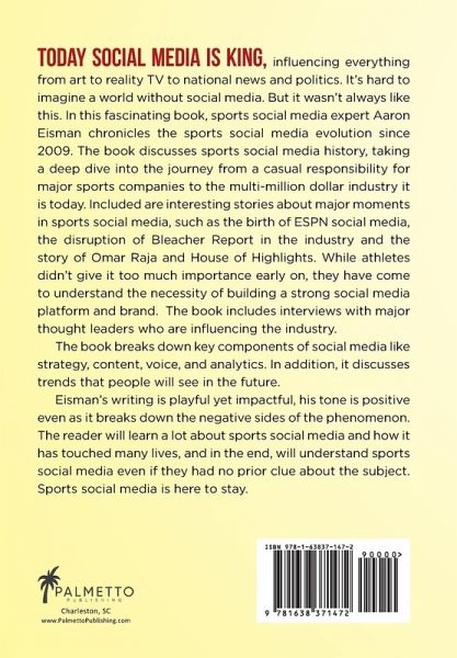 Today social media is king, influencing everything from art to reality TV to national news and politics. It's hard to imagine a world without social media. But it wasn't always like this. In this fascinating book, sports social media expert Aaron Eisman chronicles the sports social media evolution since 2009. The book discusses sports social media history, taking a deep dive into the journey from a casual responsibility for major sports companies to the multi-million dollar industry it is today. Included are interesting stories about major moments in sports social media, such as the birth of ESPN social media, the disruption of Bleacher Report in the industry and the story of Omar Raja and House of Highlights. While athletes didn't give it too much importance early on, they have come to understand the necessity of building a strong social media platform and brand. The book includes interviews with major thought leaders who are influencing the industry. The book breaks down key components of social media like strategy, content, voice, and analytics. In addition, it discusses trends that people will see in the future. Eisman's writing is playful yet impactful, his tone is positive even as it breaks down the negative sides of the phenomenon. The reader will learn a lot about sports social media and how it has touched many lives, and in the end, will understand sports social media even if they had no prior clue about the subject. Sports social media is here to stay.