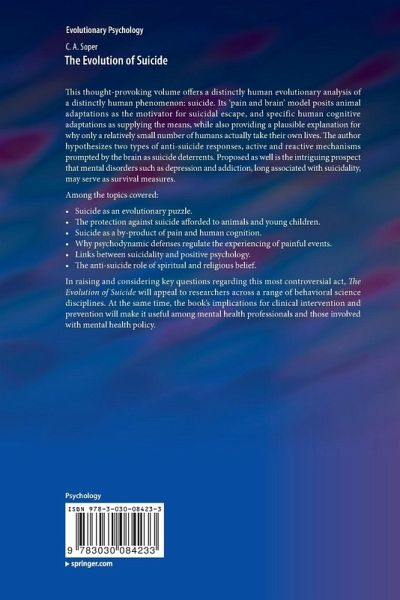 This thought-provoking volume offers a distinctly human evolutionary analysis of a distinctly human phenomenon: suicide. Its 'pain and brain' model posits animal adaptations as the motivator for suicidal escape, and specific human cognitive adaptations as supplying the means , while also providing a plausible explanation for why only a relatively small number of humans actually take their own lives. The author hypothesizes two types of anti-suicide responses, active and reactive mechanisms prompted by the brain as suicide deterrents. Proposed as well is the intriguing prospect that mental disorders such as depression and addiction, long associated with suicidality, may serve as survival measures.