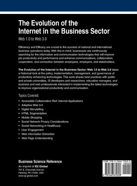 Efficiency and Efficacy are crucial to the success of national and international business operations today. With this in mind, businesses are continuously searching for the information and communication technologies that will improve job productivity and performance and enhance communications, collaboration, cooperation, and connection between employees, employers, and stakeholders. The Evolution of the Internet in the Business Sector: Web 1.0 to Web 3.0 takes a historical look at the policy, implementation, management, and governance of productivity enhancing technologies. This work shares best practices with public and private universities, IS developers and researchers, education managers, and business and web professionals interested in implementing the latest technologies to improve organizational productivity and communication.