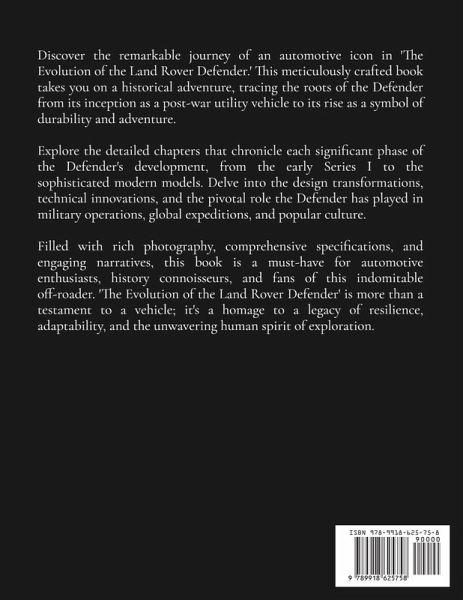 Discover the remarkable journey of an automotive icon in 'The Evolution of the Land Rover Defender.' This meticulously crafted book takes you on a historical adventure, tracing the roots of the Defender from its inception as a post-war utility vehicle to its rise as a symbol of durability and adventure. Explore the detailed chapters that chronicle each significant phase of the Defender's development, from the early Series I to the sophisticated modern models. Delve into the design transformations, technical innovations, and the pivotal role the Defender has played in military operations, global expeditions, and popular culture. Filled with rich photography, comprehensive specifications, and engaging narratives, this book is a must-have for automotive enthusiasts, history connoisseurs, and fans of this indomitable off-roader. 'The Evolution of the Land Rover Defender' is more than a testament to a vehicle; it's a homage to a legacy of resilience, adaptability, and the unwavering human spirit of exploration.