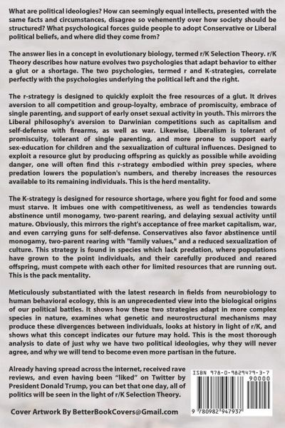 Please note that when Amazon says "out of stock," or "available in 2-6 weeks," Amazon drop ships orders from the publisher Ingram within 1-2 days and it will arrive normally. Why do people adopt different political ideologies? How can seemingly equal intellects, presented with the same facts and circumstances disagree so vehemently over how society should be structured? What psychological undercurrents guide people to adopt Conservative or Liberal political beliefs, and where did they come from? The answer lies in a well known concept in biology termed r/K Selection Theory, and this third edition is the most complete examination of this ground-breaking idea to date. r/K Theory examines how all populations tend to adopt one of two psychologies as a means of adapting their behavior to the presence or absence of environmental resources. The two strategies, termed r and K, each correlate perfectly with the psychologies underlying Liberalism and Conservatism. One strategy, named the r-strategy, imbues those who are programmed with it to be averse to all peer on peer competition, embrace promiscuity, embrace single parenting, and support early onset sexual activity in youth. Obviously, this mirrors the Liberal philosophy's aversion to individual Darwinian competitions such as capitalism and self defense with firearms, as well as group competitions such as war. Likewise, Liberalism is tolerant of promiscuity, tolerant of single parenting, and more prone to support early sex education for children and the sexualization of cultural influences. Designed to exploit a plethora of resources, one will often find this r-type strategy embodied within prey species, where predation has lowered the population's numbers, and thereby increased the resources available to it's individuals. The other strategy, termed the K-strategy, imbues those who pursue it with a fierce competitiveness, as well as tendencies towards abstinence until monogamy, two-parent parenting, and delaying sexual activity until later in life. Obviously, this mirrors Conservatism's acceptance of all sorts of competitive social schemes, from free market capitalism, to war, to individuals owning and carrying private weapons for self defense. Conservatives also tend to favor abstinence until monogamy, two parent parenting with an emphasis upon "family values," and children being shielded from any sexualized stimuli until later in life. This strategy is found most commonly in species which lack predation, and whose population's have grown to the point individuals must compete with each other for the limited environmental resources that they are rapidly running out of. Meticulously substantiated with the latest research in fields from neurobiology to human behavioral ecology, this work offers an unprecedented view into not just what governs our political battles, but why these battles have arisen within our species in the first place. From showing how these two strategies adapt in other more complex species in nature, to examining the role of a migrating history in the evolution of more complex leftist political ideals, to examining what genetic and neurostructural mechanisms may produce these divergences between individuals, to examining how the environment may alter the expression of these ideals, to showing what this theory indicates our future may hold, this work is the most thorough analysis to date of just why we have two political ideologies, why they will never agree, and why we will tend to become even more partisan in the future.