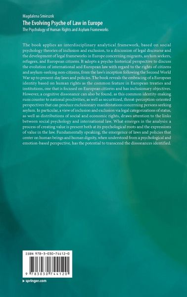 The book applies an interdisciplinary analytical framework, based on social psychology theories of inclusion and exclusion, to a discussion of legal discourse and the development of legal frameworks in Europe concerning migrants, asylum seekers, refugees, and European citizens. It adopts a psycho-historical perspective to discuss the evolution of international and European law with regard to the rights of citizens and asylum-seeking non-citizens, from the law's inception following the Second World War up to present-day laws and policies. The book reveals the embracing of a European identity based on human rights as the common feature in European treaties and institutions, one that is focused on European citizens and has inclusionary objectives. However, a cognitive dissonance can also be found, as this common identity-making runs counter to national proclivities, as well as securitized, threat-perception-oriented perspectives that can produce exclusionary manifestations concerning persons seeking asylum. In particular, a view of inclusion and exclusion via legal categorizations of status, as well as distributions of social and economic rights, draws attention to the links between social psychology and international law. What emerges in the analysis: a process of creating value is present both at its psychological roots and the expressions of value in the law. Fundamentally speaking, the emergence of laws and policies that center on human beings and human dignity, when understood from a psychological and emotion-based perspective, has the potential to transcend the dissonances identified.
