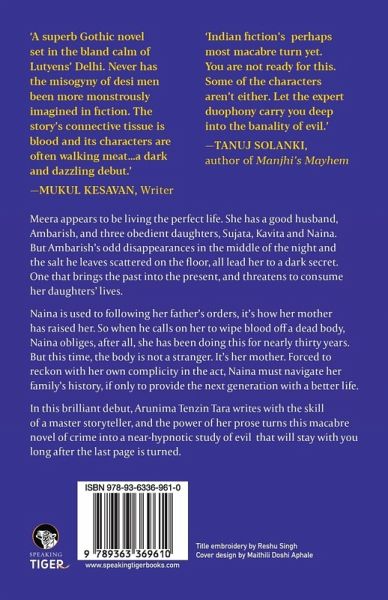 Meera appears to be living the perfect life. She has a good husband, Ambarish, and three obedient daughters, Sujata, Kavita and Naina. But Ambarish's odd disappearances in the middle of the night and the salt he leaves scattered on the floor, all lead her to a dark secret. One that brings the past into the present, and threatens to consume her daughters' lives. Naina is used to following her father's orders, it's how her mother has raised her. So when he calls on her to wipe blood off a dead body, Naina obliges, after all, she has been doing this for nearly thirty years. But this time, the body is not a stranger. It's her mother. Forced to reckon with her own complicity in the act, Naina must navigate her family's history, if only to provide the next generation with a better life. In this brilliant debut, Arunima Tenzin Tara writes with the skill of a master storyteller, and the power of her prose turns this macabre novel of crime into a near-hypnotic study of evil that will stay with you long after the last page is turned.