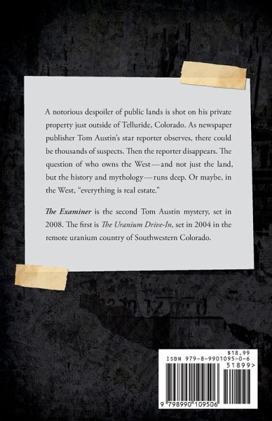 A notorious despoiler of public lands is shot on his private property just outside of Telluride, Colorado. As newspaper publisher Tom Austin's star reporter observes, there could be thousands of suspects. Then the reporter disappears. The question of who owns the West -- and not just the land, but the history and mythology -- runs deep. Or maybe, in the West, "everything is real estate." The Examiner is the second Tom Austin mystery, set in 2008. The first is The Uranium Drive, set in 2004 in the remote uranium country of Southwestern Colorado.
