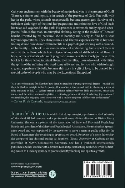 Can your enchantment with the beauty of nature lead you to the presence of God? Theresa, a sinner and mystic, is in search of the presence of God. You walk with her in the park, where animals unexpectedly become messengers. Survivor of a turbulent dark night of the soul, her pugnacious and relentless love of God leads her to an old vagabond in the park. His presence is extremely annoying and unexpected. Who is this man, in crumpled clothing, sitting in the middle of Theresa's bench? Irritated by his presence, she is horribly rude, only to find he is wise beyond expectations. They share stories, and Theresa explores secrets in her soul, finding divine providence within her life as a psychologist working with a wounded humanity. This book is for sinners who feel undeserving, but suspect there is more to life, or those who believe religion is hogwash yet still hold a small flame of hope, or the scientists who want pragmatic answers in their lonely journeys. This book is for those facing terminal illness, their families, those who work with lifting the spirits of the suffering who need some self-care, and for you who wish to laugh, cry, and experience life fully, because this story is a gift of love, to be opened by a special cadre of people who may be the Exceptional Exception!