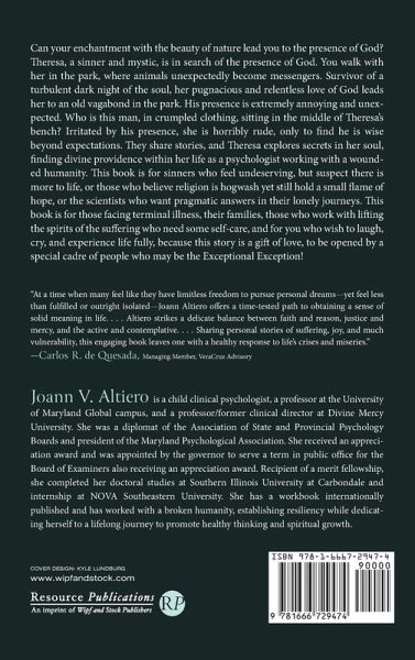 Can your enchantment with the beauty of nature lead you to the presence of God? Theresa, a sinner and mystic, is in search of the presence of God. You walk with her in the park, where animals unexpectedly become messengers. Survivor of a turbulent dark night of the soul, her pugnacious and relentless love of God leads her to an old vagabond in the park. His presence is extremely annoying and unexpected. Who is this man, in crumpled clothing, sitting in the middle of Theresa's bench? Irritated by his presence, she is horribly rude, only to find he is wise beyond expectations. They share stories, and Theresa explores secrets in her soul, finding divine providence within her life as a psychologist working with a wounded humanity. This book is for sinners who feel undeserving, but suspect there is more to life, or those who believe religion is hogwash yet still hold a small flame of hope, or the scientists who want pragmatic answers in their lonely journeys. This book is for those facing terminal illness, their families, those who work with lifting the spirits of the suffering who need some self-care, and for you who wish to laugh, cry, and experience life fully, because this story is a gift of love, to be opened by a special cadre of people who may be the Exceptional Exception!