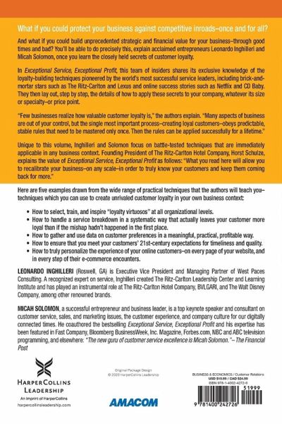 What if you could protect your business against competitive inroads, once and for all? Customer service experts Leonardo Inghilleri and Micah Solomon's anticipatory customer service approach was first developed at The Ritz-Carlton as well as at Solomon's company Oasis, and has since proven itself in countless companies around the globe--from luxury giant BVLGARI to value-sensitive auto parts leader Carquest and everywhere in between. Their experience shows that the most powerful growth engine in a tight market--and best protection from competitive inroads--is to put everything you can into cultivating true customer loyalty. Exceptional Service, Exceptional Profit takes the techniques that minted money for these brands and reveals how you can apply them to your own business to provide the kind of exceptional service that nearly guarantees loyalty. Soon, you'll be reaping the benefits of loyal customers who are: less sensitive to price competition, more forgiving of small glitches, and, ultimately, who are "walking billboards" happily promoting your brand. Filled with detailed, behind-the-scenes examples, Exceptional Service, Exceptional Profit unlocks a new level of customer relationship that leaves your competitors in the dust, your customers coming back day after day, and your bottom line looking better than it ever has before.