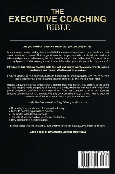 Are you the most effective leader that you can possibly be? Chances are, if you're reading this, you still think there are some aspects of your leadership that could be further improved. But the good news is that you've made the decision to seek out advice and guidance on becoming the best possible leader. Even better news? You've come to the right place to find absolutely every piece of information you could possibly need to know! Introducing The Executive Coaching Bible, the fast and simple way to elevate your business leadership and master effective communication. If you're looking for the definitive guide on becoming an effective leader and you're serious about upping your skills to stand out amongst the rest, this one is a must-read. Instead of paying hundreds of dollars for a generic "business mentor," you can find all the same valuable insights inside the pages of this one true guide, which you can read and reread until you're completely confident in your new skills. From basic leadership skills to mastering effective communication and strategizing, this book contains everything you need to become an exceptional leader who can inspire your team to success. Inside The Executive Coaching Bible, you will discover: * How to lay the foundations of effective leadership. * Steps to developing a leader's mindset. * The ladder to leadership success. * The role of communication in effective leadership. * How to become a decisive leader. It's time to become the influential, authoritative figure you have always dreamed of being. Grab a copy of The Executive Coaching Bible today!